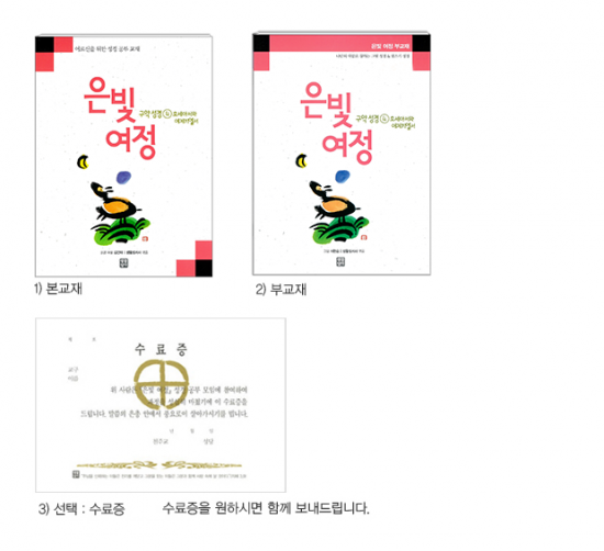 * '기본 과정' 『은빛 여정』은 본교재와 부교재('나만의 색깔로 칠하는 그림 성경 & 덧쓰기 성경') 그리고 수료증서로 구성되어 있다.