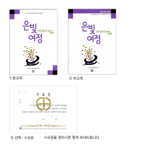 * '기본 과정' 『은빛 여정』은 본교재와 부교재('나만의 색깔로 칠하는 그림 성경 & 덧쓰기 성경') 그리고 수료증서로 구성되어 있다.
