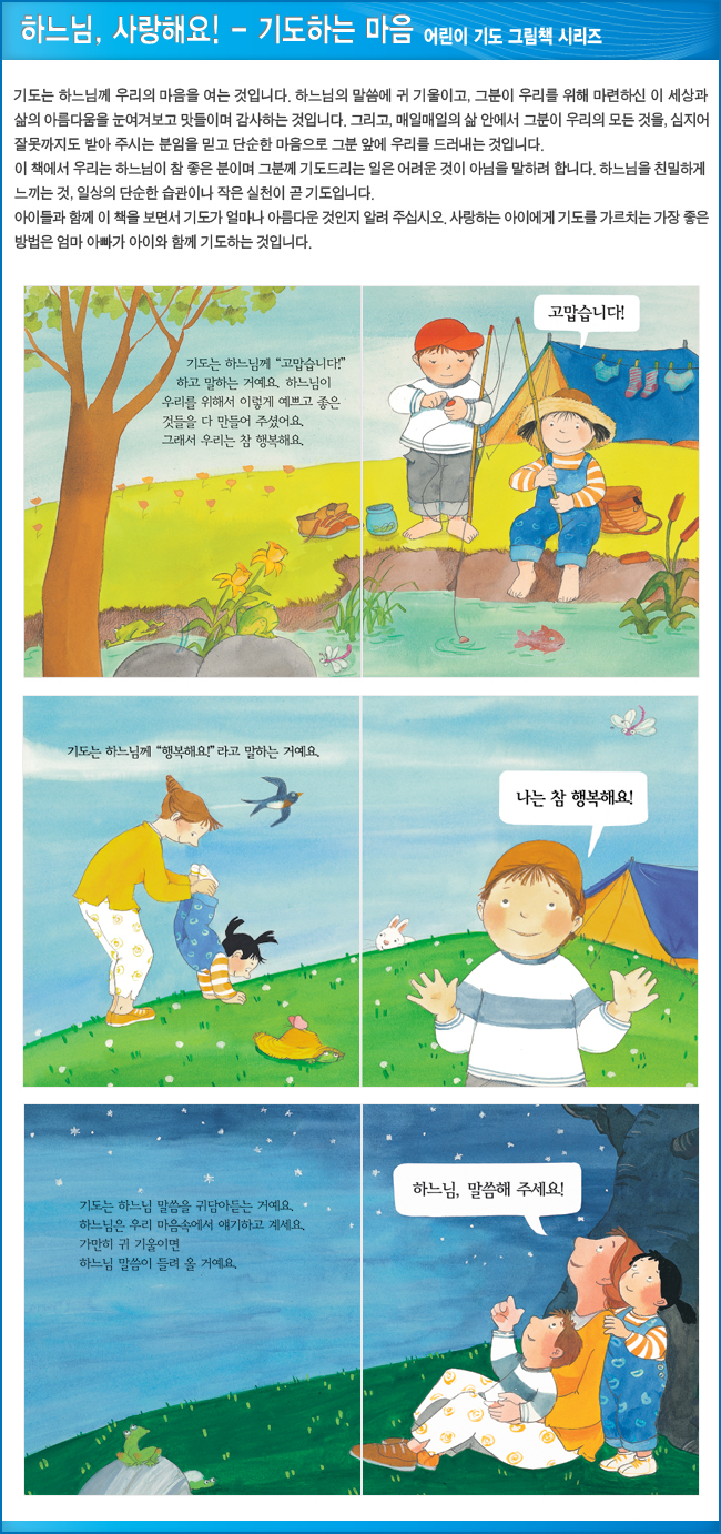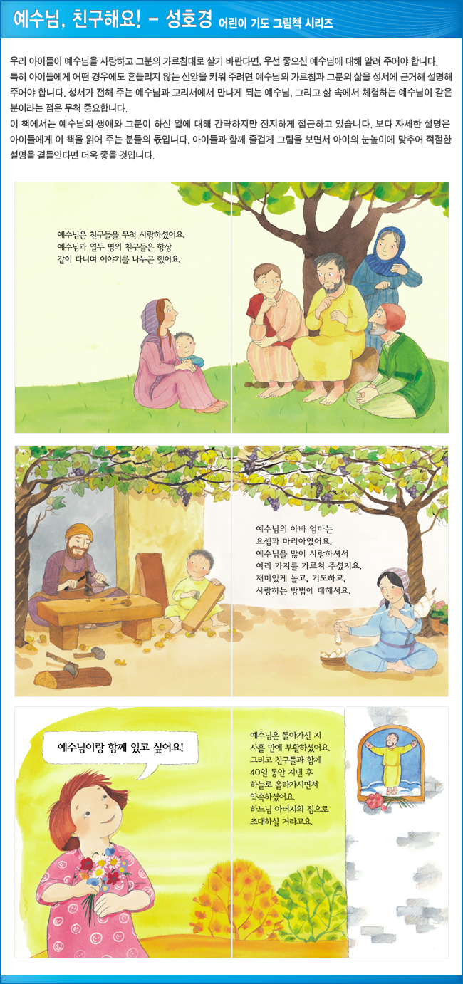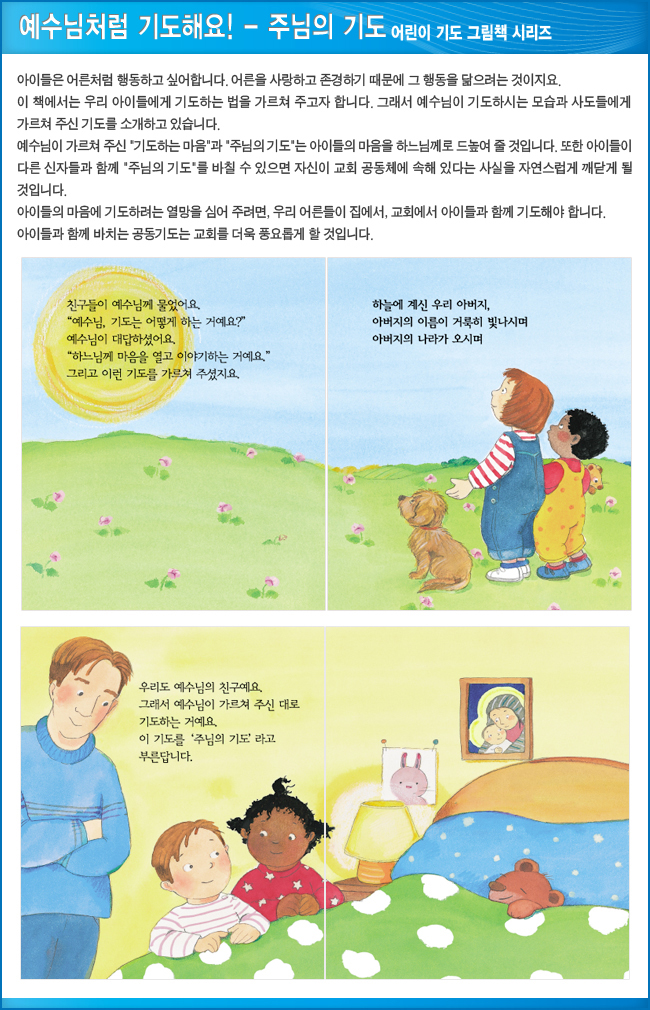 《어린이 기도 그림책》 시리즈 4 권은 이런 까다로운 요구 사항을 모두 충족시킨다. 이 책은 기도란 무엇이며 기도는 어떤 마음으로 드려야 하는지 보여 준다. 그리고 성호경과 주님의 기도, 그리고 성모송 전문을 실었다. 또한 기도문에 맞추어 예수와 마리아의 생애 및 초대 교회 사도들의 활동상을 재구성하였다. 따라서 기도문의 의미를 설명할 뿐만 아니라 기초 교리서 역할도 겸하는 것이다. 아이의 감성과 눈높이에 맞는 단순하고 간략한 설명, 따뜻하고 사랑스러운 그림을 보는 동안 아직 글자를 모르는 어린아이들 역시 하느님, 예수님, 성모님, 그리고 기도에 자연스럽게 친밀감을 느끼게 될 것이다. 그리고 미사에도 신나게, 자발적으로 참여하게 될 것이다. 따라서 이 책은 아이들이 신앙생활에 흥미를 느끼게 하는 데 어려움을 겪고 있거나 혹은 아이들의 신앙 지도에 많은 관심을 갖고 있는 여러 부모나 교사에게 큰 도움이 되리라 본다. 무엇보다 이 책은 아이에게 기도를 가르치는 일이 아이와 함께 기도를 드리는 것임을 강조한다는 점에서 출간할 가치가 충분하다고 하겠다.