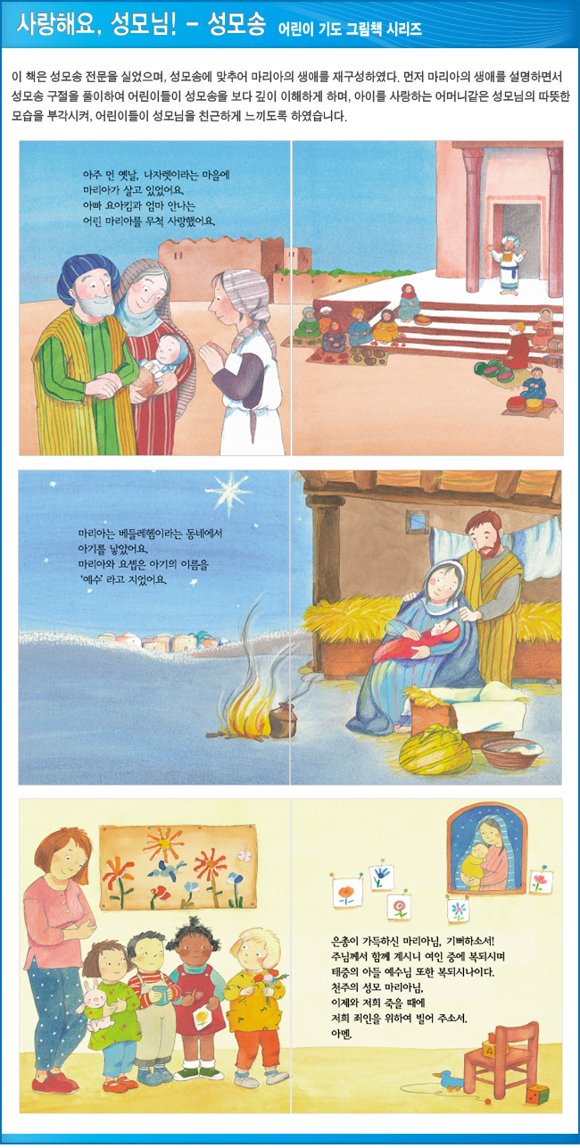 이 책은 성모송 전문을 실었으며, 성모송에 맞추어 마리아의 생애를 재구성하였다. 먼저 마리아의 생애를 설명하면서 성모송 구절을 풀이하여 어린이들이 성모송을 보다 깊이 이해하게 하며, 아이를 사랑하는 어머니같은 성모님의 따뜻한 모습을 부각시켜, 어린이들이 성모님을 친근하게 느끼도록 하였다.