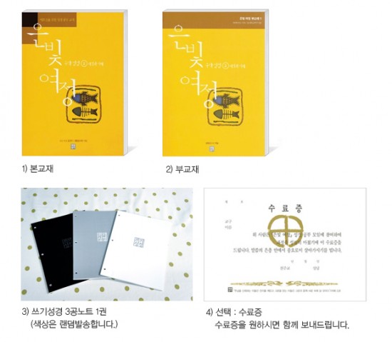 '은빛여정'은 본 교재 1권에 따른 부교재 2권과 수료증서로 이루어져 있습니다.