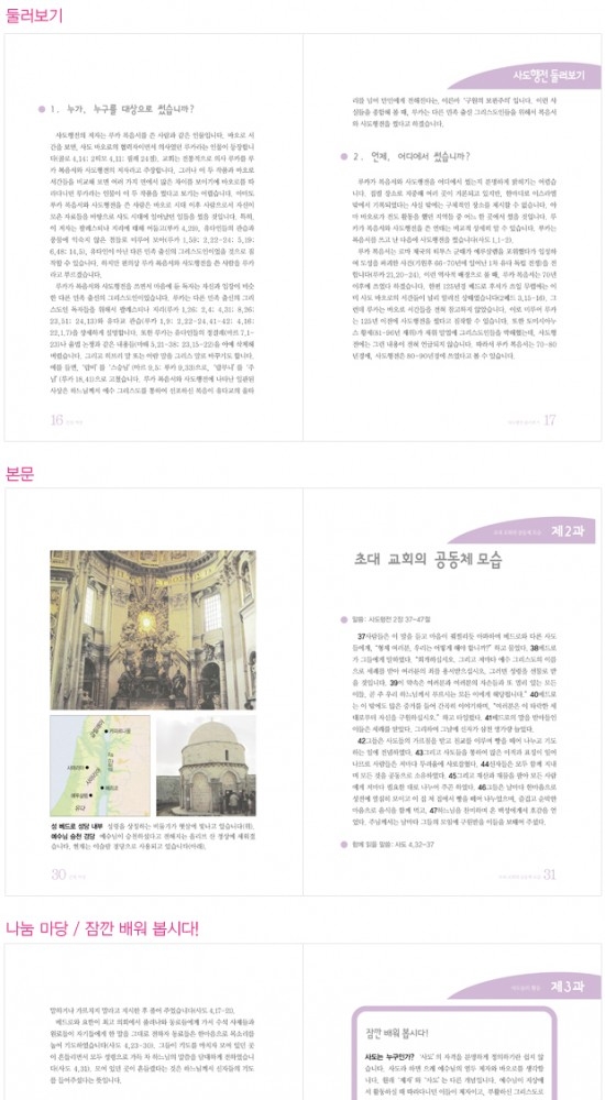 '은빛여정'은 각 권이 16주 과정으로 이루어져 있어 한 학기에 한 권씩 이수하여 전체 2년(4학기)에 걸쳐 성경 전반에 대해 익힐 수 있습니다. <은빛여정>은 관련 성지 사진을 컬러 화보로 엮어서 신앙과 역사의 현장을 생생하게 느낄 수 있도록 하였습니다. <은빛여정>은 부교재를 활용하여 `성경 그림 색칠하기`와 `성경 옮겨 쓰기`, `성경 덧쓰기`와 같은 다양한 활동과 충분한 나눔을 할 수 있게 하였습니다. <은빛여정>은 한글을 모르는 어르신들을 위해 부교재1에 `덧쓰기 성경` 부분을 첨가하였습니다. `덧쓰기`는 순 우리말로, 이미 씌어진 글자 위에 겹쳐 쓰는 것을 의미합니다. <은빛여정>은 일반적으로 `노년의 색`이라고 알려진 무채색 사용을 과감히 탈피하여 표지에서부터 산뜻한 파스텔 톤 색깔을 사용하였고, 교재 내용 전체를 컬러로 꾸몄습니다.