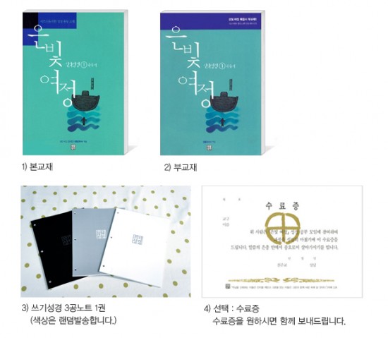 '은빛여정'은 본 교재 1권에 따른 부교재 2권과 수료증서로 이루어져 있습니다.