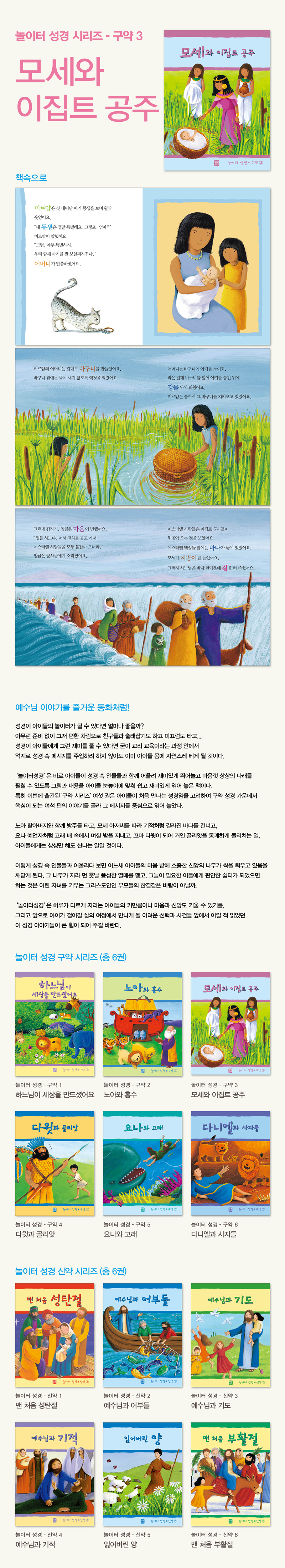 <가톨릭 신문 2006년 6월 11일 박영호 기자> `말씀’과 함께 놀아볼까 성경이 아이들 놀이터라면? 아무런 부담 없이, 그저 즐겁고 신나게 편한 차림으로 친구들과 술래잡기도 하고 미끄럼도 탈 수 있는 그런 어린이들 놀이터가 된다면 아이들의 신앙생활에도 크게 도움이 될 듯하다. 특히 성경을 놀이터 삼아 성경 속에 나오는 인물들과 친숙하게 되고 이들과 재미있게 뛰어놀고 마음껏 상상의 나래를 펼칠 수 있다면 굳이 딱딱한 의자 위에 힘들게 앉아 교리교육이라는 틀을 통해 하느님 말씀을 주입시키려 애쓰지 않아도 될 것이다. 생활성서사가 펴낸 〈놀이터 성경〉시리즈는 바로 이런 취지로 기획됐다. 성경의 그림과 내용들을 아이들 눈높이에 맞춰 쉽고 재미있게 엮어둠으로써 아이들이 성경을 친근하게 접하도록 이끈다. 첫 편으로 나온 구약 6권은 아이들이 처음 만나는 성경임을 고려해 구약 성경 가운데 가장 핵심적인 여섯 편의 이야기를 골라 그 메시지를 중심으로 엮었다. 1권 ‘하느님이 세상을 만드셨어요’는 하느님의 창조를 흥미롭게 전하고, 2권 ‘노아와 홍수’에서는 노아 할아버지와 함께 방주를 탄다. 이어 3권부터 6권까지 아이들은 모세 아저씨를 따라 갈라진 바다를 건너고 요나처럼 고래 뱃속에서 며칠 밤을 보낸다. 또 꼬마 다윗이 되어 거인 골리앗을 물리친다.
