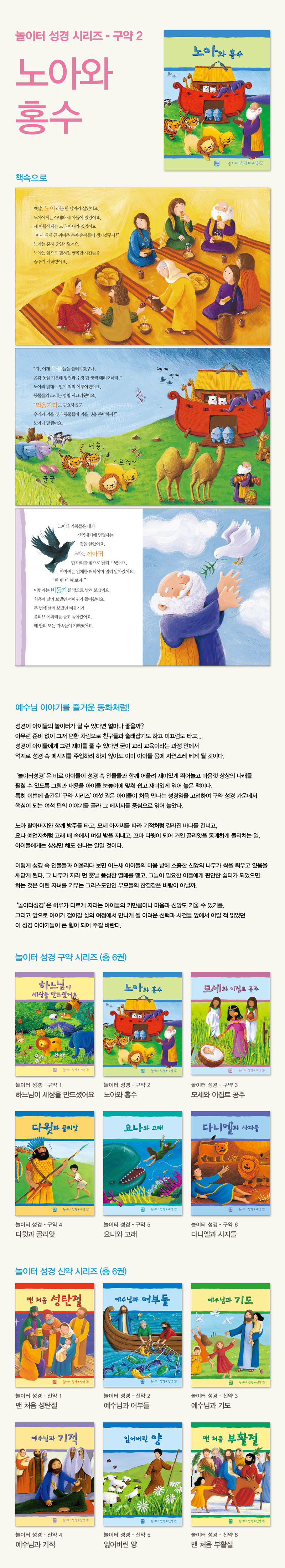 <가톨릭 신문 2006년 6월 11일 박영호 기자> `말씀’과 함께 놀아볼까 성경이 아이들 놀이터라면? 아무런 부담 없이, 그저 즐겁고 신나게 편한 차림으로 친구들과 술래잡기도 하고 미끄럼도 탈 수 있는 그런 어린이들 놀이터가 된다면 아이들의 신앙생활에도 크게 도움이 될 듯하다. 특히 성경을 놀이터 삼아 성경 속에 나오는 인물들과 친숙하게 되고 이들과 재미있게 뛰어놀고 마음껏 상상의 나래를 펼칠 수 있다면 굳이 딱딱한 의자 위에 힘들게 앉아 교리교육이라는 틀을 통해 하느님 말씀을 주입시키려 애쓰지 않아도 될 것이다. 생활성서사가 펴낸 〈놀이터 성경〉시리즈는 바로 이런 취지로 기획됐다. 성경의 그림과 내용들을 아이들 눈높이에 맞춰 쉽고 재미있게 엮어둠으로써 아이들이 성경을 친근하게 접하도록 이끈다. 첫 편으로 나온 구약 6권은 아이들이 처음 만나는 성경임을 고려해 구약 성경 가운데 가장 핵심적인 여섯 편의 이야기를 골라 그 메시지를 중심으로 엮었다. 1권 ‘하느님이 세상을 만드셨어요’는 하느님의 창조를 흥미롭게 전하고, 2권 ‘노아와 홍수’에서는 노아 할아버지와 함께 방주를 탄다. 이어 3권부터 6권까지 아이들은 모세 아저씨를 따라 갈라진 바다를 건너고 요나처럼 고래 뱃속에서 며칠 밤을 보낸다. 또 꼬마 다윗이 되어 거인 골리앗을 물리친다.
