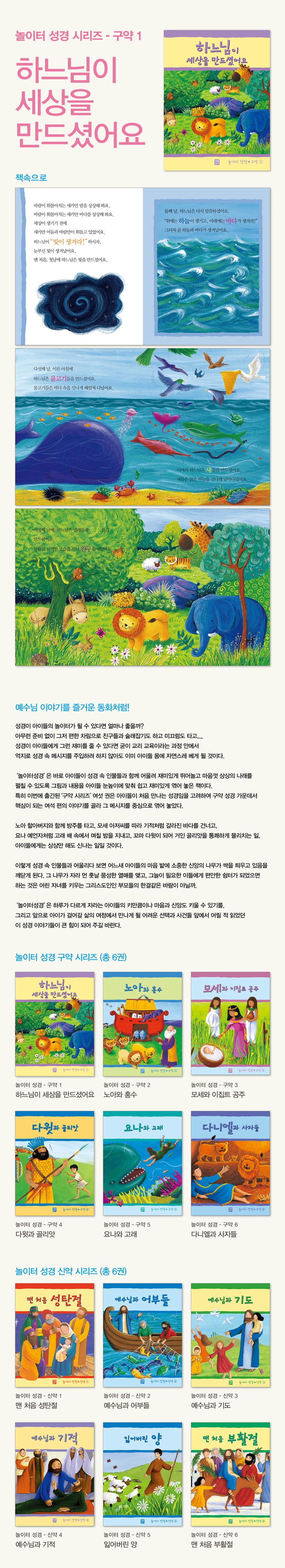 <가톨릭 신문 2006년 6월 11일 박영호 기자> `말씀’과 함께 놀아볼까 성경이 아이들 놀이터라면? 아무런 부담 없이, 그저 즐겁고 신나게 편한 차림으로 친구들과 술래잡기도 하고 미끄럼도 탈 수 있는 그런 어린이들 놀이터가 된다면 아이들의 신앙생활에도 크게 도움이 될 듯하다. 특히 성경을 놀이터 삼아 성경 속에 나오는 인물들과 친숙하게 되고 이들과 재미있게 뛰어놀고 마음껏 상상의 나래를 펼칠 수 있다면 굳이 딱딱한 의자 위에 힘들게 앉아 교리교육이라는 틀을 통해 하느님 말씀을 주입시키려 애쓰지 않아도 될 것이다. 생활성서사가 펴낸 〈놀이터 성경〉시리즈는 바로 이런 취지로 기획됐다. 성경의 그림과 내용들을 아이들 눈높이에 맞춰 쉽고 재미있게 엮어둠으로써 아이들이 성경을 친근하게 접하도록 이끈다. 첫 편으로 나온 구약 6권은 아이들이 처음 만나는 성경임을 고려해 구약 성경 가운데 가장 핵심적인 여섯 편의 이야기를 골라 그 메시지를 중심으로 엮었다. 1권 ‘하느님이 세상을 만드셨어요’는 하느님의 창조를 흥미롭게 전하고, 2권 ‘노아와 홍수’에서는 노아 할아버지와 함께 방주를 탄다. 이어 3권부터 6권까지 아이들은 모세 아저씨를 따라 갈라진 바다를 건너고 요나처럼 고래 뱃속에서 며칠 밤을 보낸다. 또 꼬마 다윗이 되어 거인 골리앗을 물리친다.