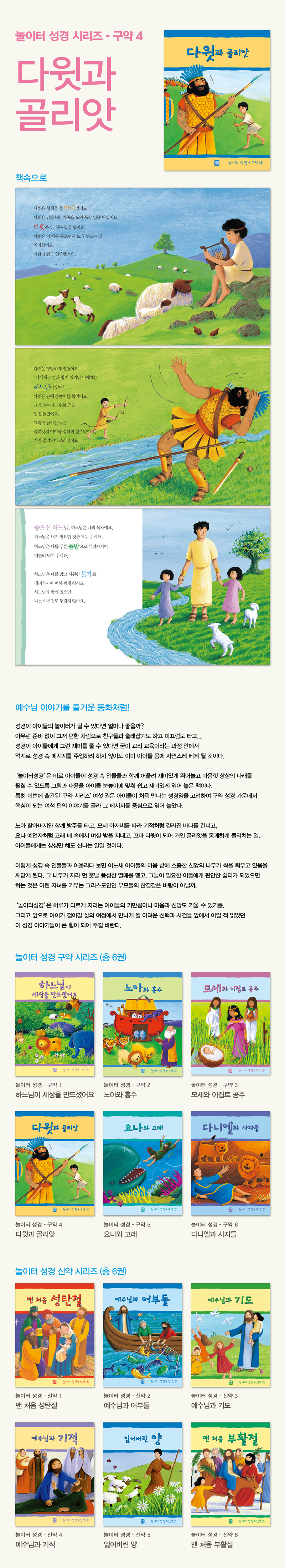 <가톨릭 신문 2006년 6월 11일 박영호 기자> `말씀’과 함께 놀아볼까 성경이 아이들 놀이터라면? 아무런 부담 없이, 그저 즐겁고 신나게 편한 차림으로 친구들과 술래잡기도 하고 미끄럼도 탈 수 있는 그런 어린이들 놀이터가 된다면 아이들의 신앙생활에도 크게 도움이 될 듯하다. 특히 성경을 놀이터 삼아 성경 속에 나오는 인물들과 친숙하게 되고 이들과 재미있게 뛰어놀고 마음껏 상상의 나래를 펼칠 수 있다면 굳이 딱딱한 의자 위에 힘들게 앉아 교리교육이라는 틀을 통해 하느님 말씀을 주입시키려 애쓰지 않아도 될 것이다. 생활성서사가 펴낸 〈놀이터 성경〉시리즈는 바로 이런 취지로 기획됐다. 성경의 그림과 내용들을 아이들 눈높이에 맞춰 쉽고 재미있게 엮어둠으로써 아이들이 성경을 친근하게 접하도록 이끈다. 첫 편으로 나온 구약 6권은 아이들이 처음 만나는 성경임을 고려해 구약 성경 가운데 가장 핵심적인 여섯 편의 이야기를 골라 그 메시지를 중심으로 엮었다. 1권 ‘하느님이 세상을 만드셨어요’는 하느님의 창조를 흥미롭게 전하고, 2권 ‘노아와 홍수’에서는 노아 할아버지와 함께 방주를 탄다. 이어 3권부터 6권까지 아이들은 모세 아저씨를 따라 갈라진 바다를 건너고 요나처럼 고래 뱃속에서 며칠 밤을 보낸다. 또 꼬마 다윗이 되어 거인 골리앗을 물리친다.