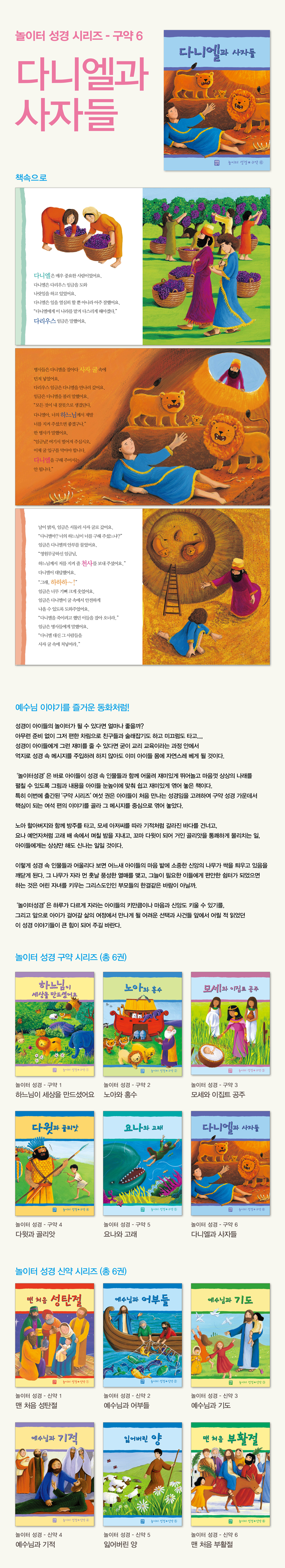 <가톨릭 신문 2006년 6월 11일 박영호 기자> `말씀’과 함께 놀아볼까 성경이 아이들 놀이터라면? 아무런 부담 없이, 그저 즐겁고 신나게 편한 차림으로 친구들과 술래잡기도 하고 미끄럼도 탈 수 있는 그런 어린이들 놀이터가 된다면 아이들의 신앙생활에도 크게 도움이 될 듯하다. 특히 성경을 놀이터 삼아 성경 속에 나오는 인물들과 친숙하게 되고 이들과 재미있게 뛰어놀고 마음껏 상상의 나래를 펼칠 수 있다면 굳이 딱딱한 의자 위에 힘들게 앉아 교리교육이라는 틀을 통해 하느님 말씀을 주입시키려 애쓰지 않아도 될 것이다. 생활성서사가 펴낸 〈놀이터 성경〉시리즈는 바로 이런 취지로 기획됐다. 성경의 그림과 내용들을 아이들 눈높이에 맞춰 쉽고 재미있게 엮어둠으로써 아이들이 성경을 친근하게 접하도록 이끈다. 첫 편으로 나온 구약 6권은 아이들이 처음 만나는 성경임을 고려해 구약 성경 가운데 가장 핵심적인 여섯 편의 이야기를 골라 그 메시지를 중심으로 엮었다. 1권 ‘하느님이 세상을 만드셨어요’는 하느님의 창조를 흥미롭게 전하고, 2권 ‘노아와 홍수’에서는 노아 할아버지와 함께 방주를 탄다. 이어 3권부터 6권까지 아이들은 모세 아저씨를 따라 갈라진 바다를 건너고 요나처럼 고래 뱃속에서 며칠 밤을 보낸다. 또 꼬마 다윗이 되어 거인 골리앗을 물리친다.