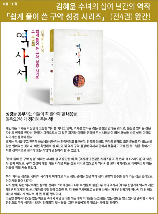 광주가톨릭대 교수 김혜윤 수녀의 '쉽게 풀어 쓴 구약 성경, 그 두 번째' 「역사서 1」이 나왔다. 김 수녀가 지난해 봄 '쉽게 풀어 쓴 구약 성경 그 첫 번째' 「모세오경」에 이은 「역사서 1」은 구약성경 역사서 전반을 개관하면서(제1부 입문적 설명), 역사서를 신명기계 역사서와 역대기계 역사서로 구분해 각각에 대해 좀더 세분해서 고찰한다(제2부 신명기계 역사서 개관, 제4부 역대기계 역사서 개관).