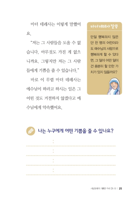- 25쪽, ‘04 사람들에게 기쁨을 주러 갑니다’의 ‘마더 데레사 말씀’