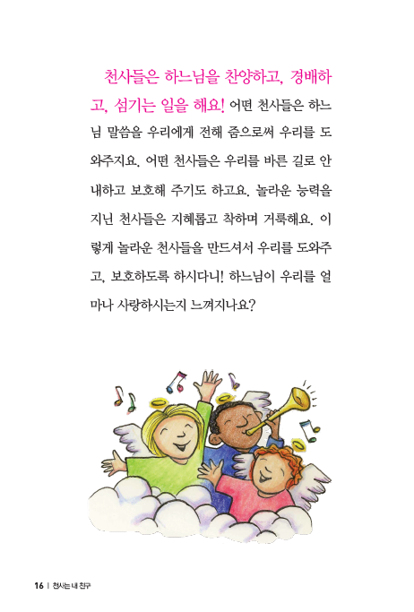 『천사는 내 친구』는 어린이들에게 어떻게 하면 천사처럼 행동할 수 있는지 알려 주면서 하느님을 닮은 존재로서 우리 인간의 자긍심을 높여 주고, 우리 어린이들의 인격과 윤리·도덕적인 의식을 높여 준다. 그리고 우리를 늘 지켜주는 수호천사에 대해서도 자세히 알려 주어 어린이들을 사랑하시는 하느님을 더욱 깊이 만날 수 있다.