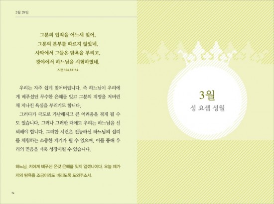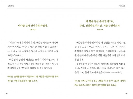 이 책의 가장 큰 장점은 교회 전례력에 따라 묵상할 수 있다는 것이다. 즉 사순 시기, 부활 시기, 대림 시기, 성탄 시기는 물론, 대축일, 축일 및 기념일에 맞는 시편과 묵상 글, 기도를 읽고 묵상하며 바칠 수 있다. 예를 들어 3월 25일 ‘주님 탄생 예고 대축일’에는 성모님이 가브리엘 천사에게 주님 탄생 예고를 받는 과정에서 하느님의 말씀에 순종하신 성모님을 묵상할 수 있도록 돕고, 7월 3일 ‘성 토마스 사도 축일’에는 부활하신 예수님이 주님이심을 고백한 토마스 사도에 대해 묵상할 수 있도록 돕는다. 특히 이 책의 말미에는 교회 전례에서 가장 중요한 ‘파스카 성삼일’, 즉 성목요일, 성금요일, 성토요일, 주님 부활 대축일에 묵상할 수 있는 시편, 묵상 글, 기도가 별도로 수록되어 있어, 교회에서 가장 은혜로운 시기인 ‘파스카 성삼일’을 더욱 특별하게 보낼 수 있다. 이처럼 이 책은 전례와 관련된 시편을 묵상할 수 있도록 이끌어 주기에, 이 책을 읽으며 묵상하다 보면 어느새 교회 전례력에 맞춰 365일을 보내는 나를 발견하게 될 것이다.