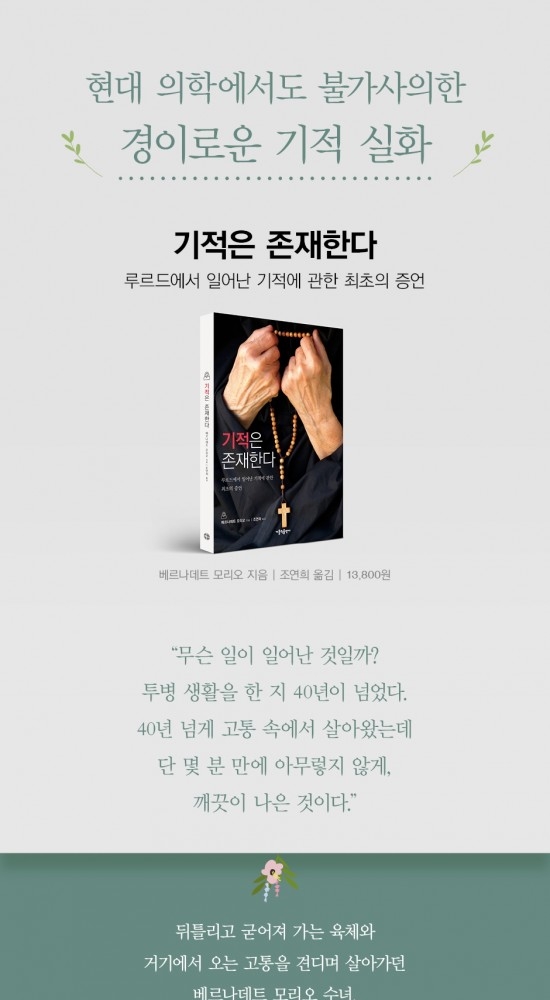 그러나 기적은 존재한다. 가톨릭출판사에서는 모든 고통 속에서 희망을 잃어버린 이들에게 하느님의 선물인 ‘기적’이 현실에 존재함을 보여 주는 책, 《기적은 존재한다》를 펴냈다. 이 책은 40여 년간 육체적 고통, 그 고통에 수반되는 정신적 고통 속에서 살아온 베르나데트 모리오 수녀가 루르드에 순례를 다녀와서 기적적으로 치유된 이야기, 치유된 사례가 공식적으로 기적임을 인정받은 후 달라진 삶까지 모든 것을 담았다. 모리오 수녀는 고통받는 다른 이들이 희망을 가질 수 있도록 자신이 직접 기적을 겪은 사실을 이야기한다.