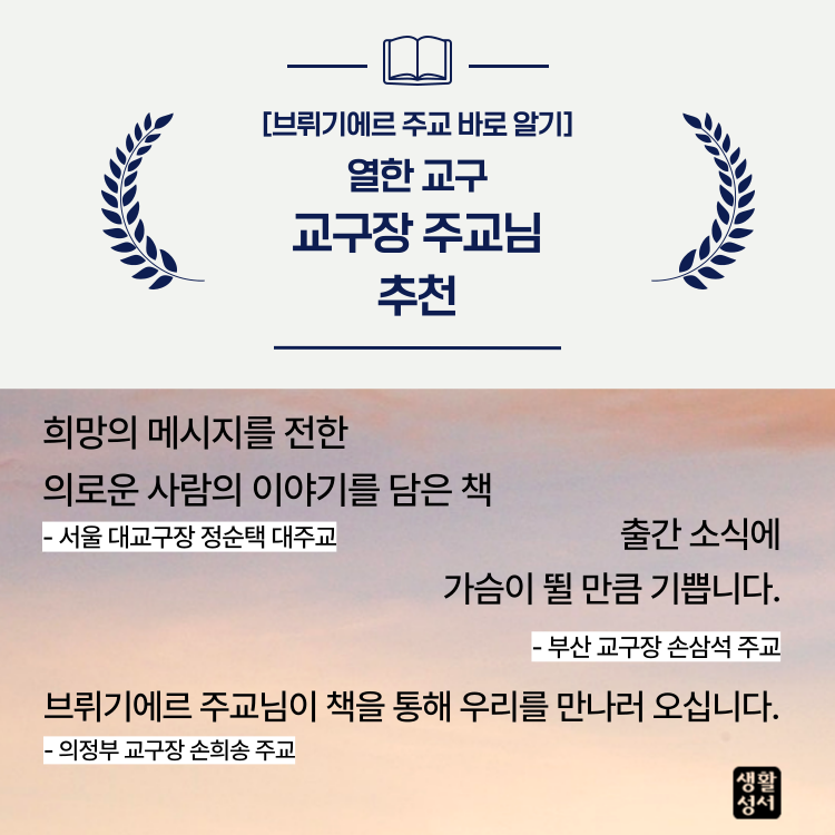 “역사 안에서 삶의 이정표를 제시한 분들의 이야기를 보고 들을 때마다, 늘 설렘과 함께 큰 감동이 다가옵니다. 특별히 이번에 출간되는 ‘하느님의 종’ 브뤼기에르 주교님에 대한 책은 독자들에게 초기 한국 교회의 배경을 알려 줄 뿐 아니라, 밀알과 같은 선교사의 모습을 우리에게 신앙의 유산으로 건네줍니다. … 뜨거웠던 그분의 선교 열정이 오늘 우리 신앙을 비추는 행복한 삶의 큰 거울이 되길 바라봅니다.”