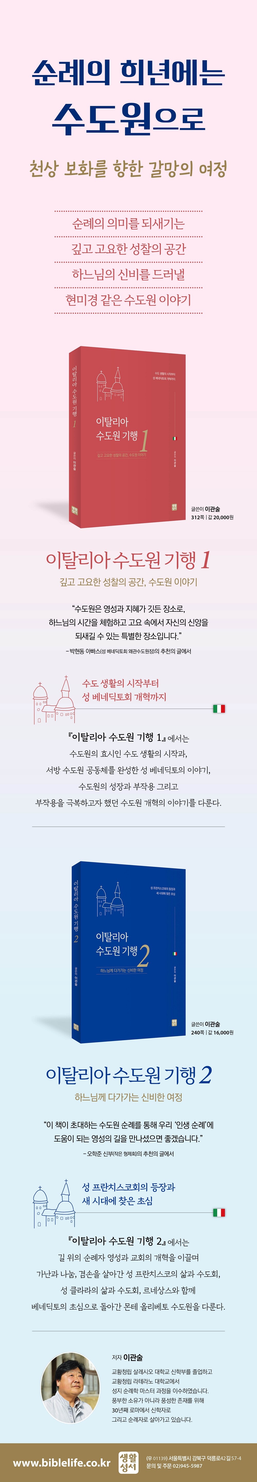 하느님의 신비를 드러낼 현미경 같은 역할을 한 이탈리아 수도원의 역사와 현재를 이탈리아 성지 순례 가이드인 작가의 유려한 설명과 생생한 사진으로 전달해 주는 책. 1권에서는 수도 생활의 역사와 성 베네딕토회의 등장과 성장, 수도회의 세속화에 저항한 개혁 수도회들의 등장을 다룬다.
