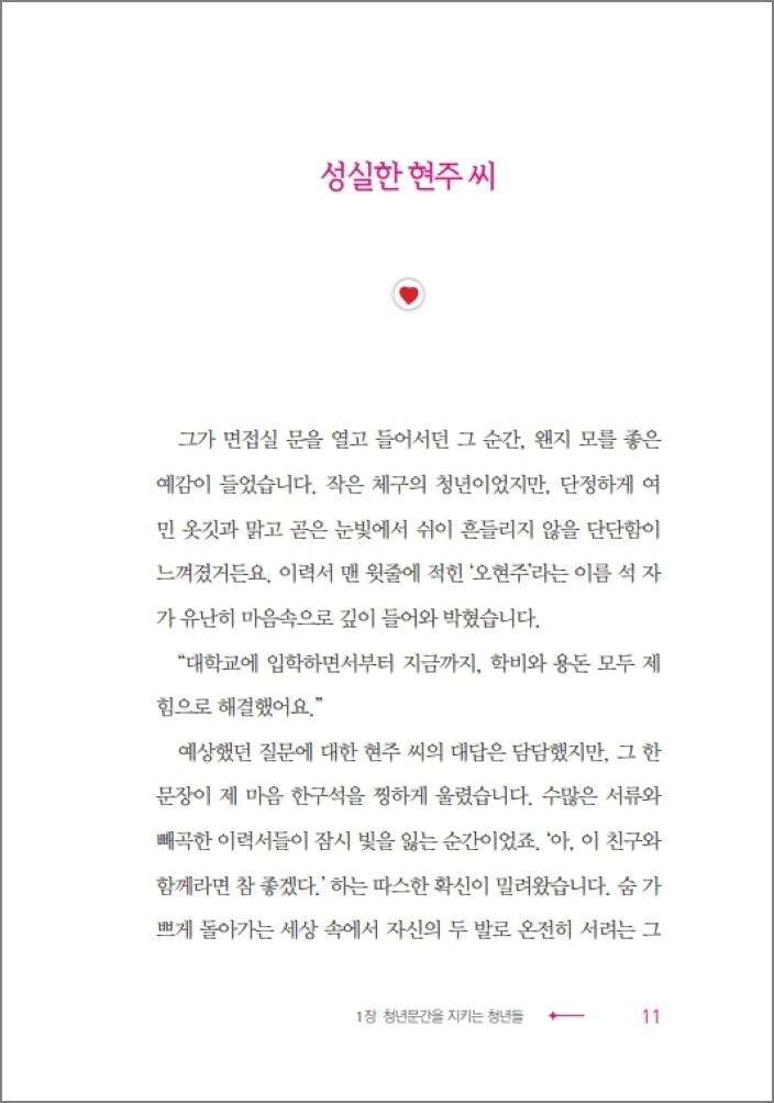 3장 ‘반짝반짝 빛나는 청년들’에서는 세상이 어두워도 자기 자리에서 빛을 내는 아름다운 청년들의 이야기를 다룬다. 타인을 돕기 위한 꿈을 꾸고, 남들이 보기에는 무모할지도 모르는 그 꿈을 향해 도전하는 청년, 또 자신도 벌이가 넉넉지 않고 건강이 온전하지 않은데도 다른 이들을 위해 기부와 봉사를 계속하는 청년의 이야기가 특히 마음을 적신다.