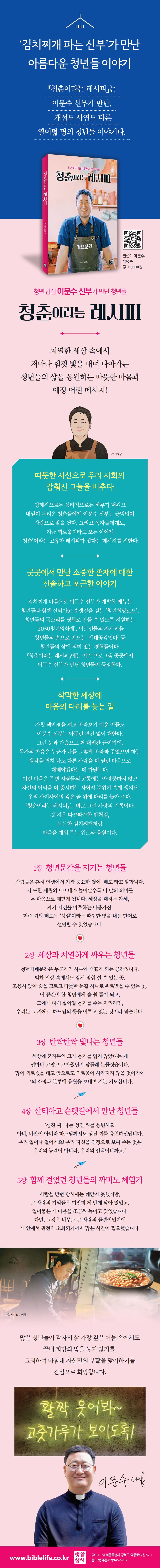 경제적으로든 심리적으로든 하루가 버겁고 내일이 두려운 청춘들에게 이문수 신부는 끊임없이 사랑으로 말을 건다. 그리고 독자들에게도, 지금 괴로울지라도 모든 이이에게 ‘청춘’이라는 고유한 레시피가 있다는 메시지를 전한다. 우리 모두는 분명 세상 어디에도 없는 맛을 내는 훌륭한 음식을 만들 수 있을 거라며, 그동안 그가 만나 왔던 우리 주변의 청년들 이야기를 조심스레 풀어놓는다. 그 이야기는 ‘나만 이런 건 아니구나.’ 하는 안도감과 함께, 나와 비슷하거나 더 큰 어려움을 이겨 낸 또래들에게서 힘을 얻게 해 준다.