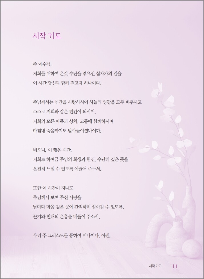 사순 시기는 예수님이 부활하시기 전 죽음을 준비하던 시기로 사순四旬, 즉 40일 동안의 기간이다. 이 기간 동안 죽음을 바로 앞둔 골고타 여정을 담은 14처 기도를 바치며 예수님이 우리를 위해 얼마나 험난한 길을 걸으셨는지, 우리를 얼마나 많이 사랑하셨는지를 깨닫게 된다.