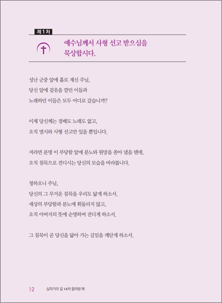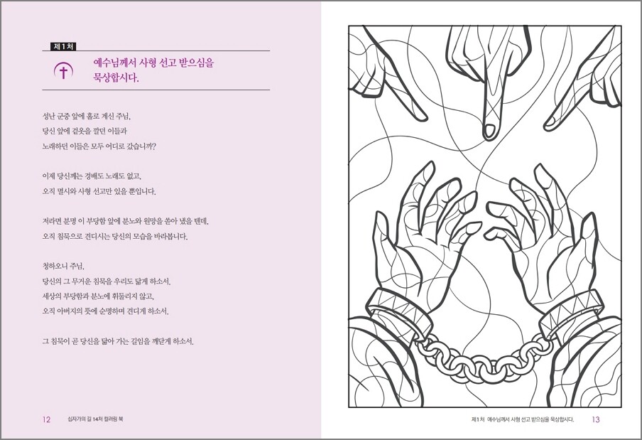 『십자가의 길 컬러링 BOOK』은 예수님의 고난을 기억하며 십자가의 길 14처를 돌며 바치는 기도인 ‘십자가의 길 기도’를 컬러링과 묵상으로 함께하는 책이다.
