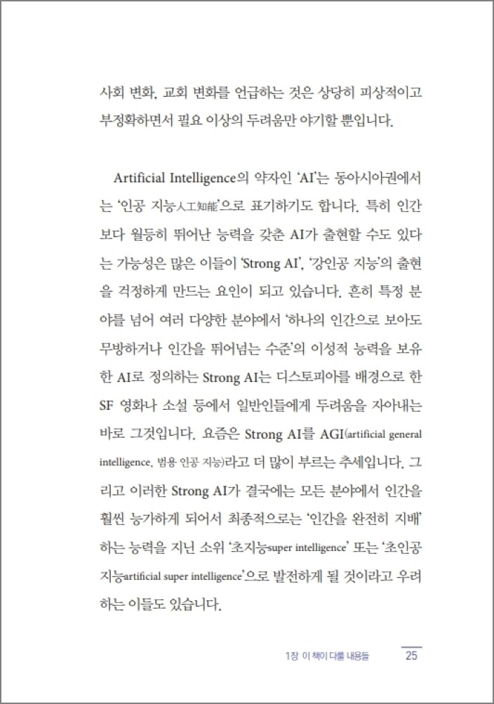 “AI 시대의 도래는 우리의 삶과 심지어는 신앙에까지도 직접적인 영향을 미칠 것으로 충분히 예상해 볼 수 있습니다. 그렇다면 우리의 삶과 신앙은 과연 어느 정도나 심각한 영향을 받게 될까요? 그리고 우리는 이러한 상황에서 과연 어떻게 살고 어떻게 믿어야 하는 것일까요?” - ‘들어가는 말’ 중에서